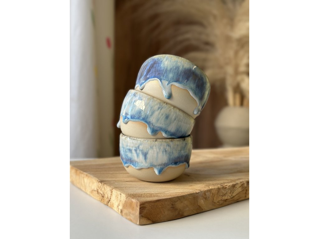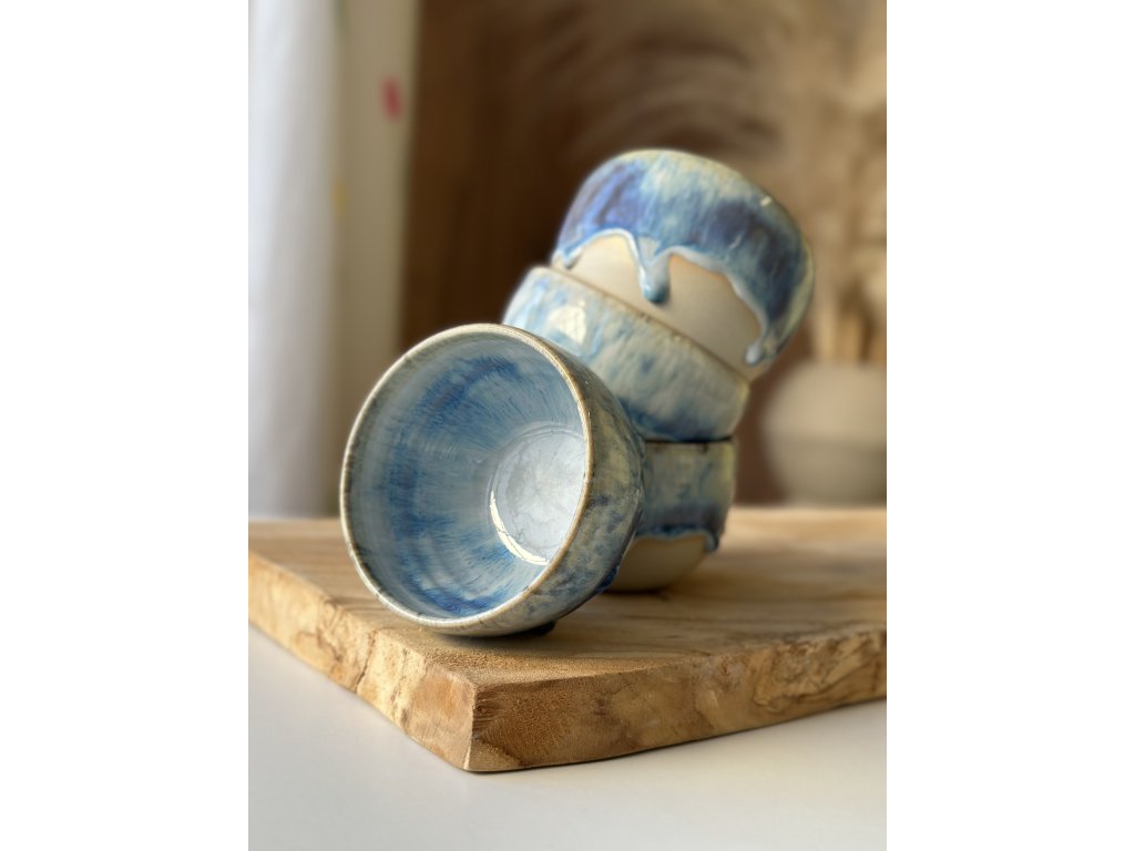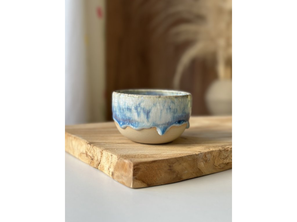 Ručně vyrobený kalíšek z kameniny, který vznikl na hrnčířském kruhu.