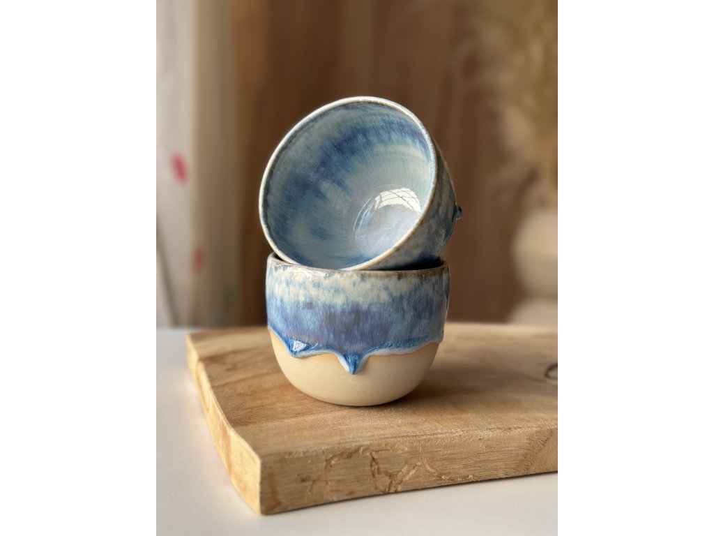 Ručně vyrobený kalíšek z kameniny, který vznikl na hrnčířském kruhu.