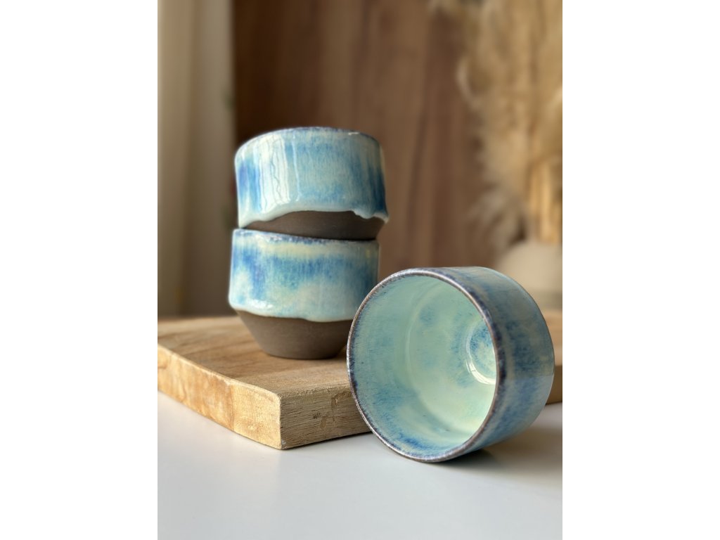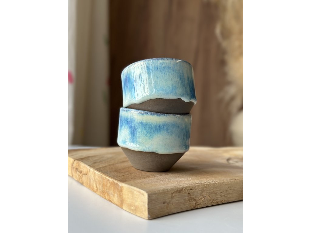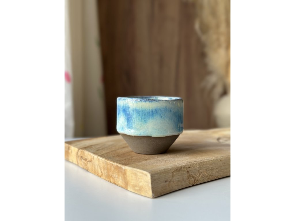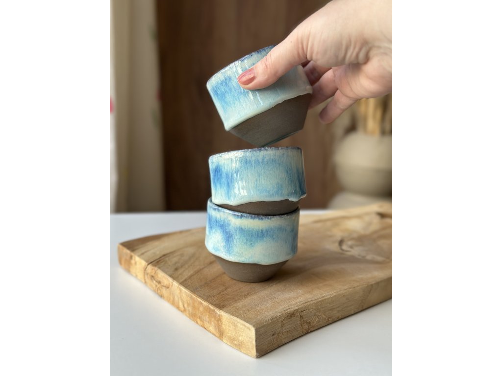 Ručně vyrobený kalíšek z kameniny, který vznikl litím do sádrových forem.