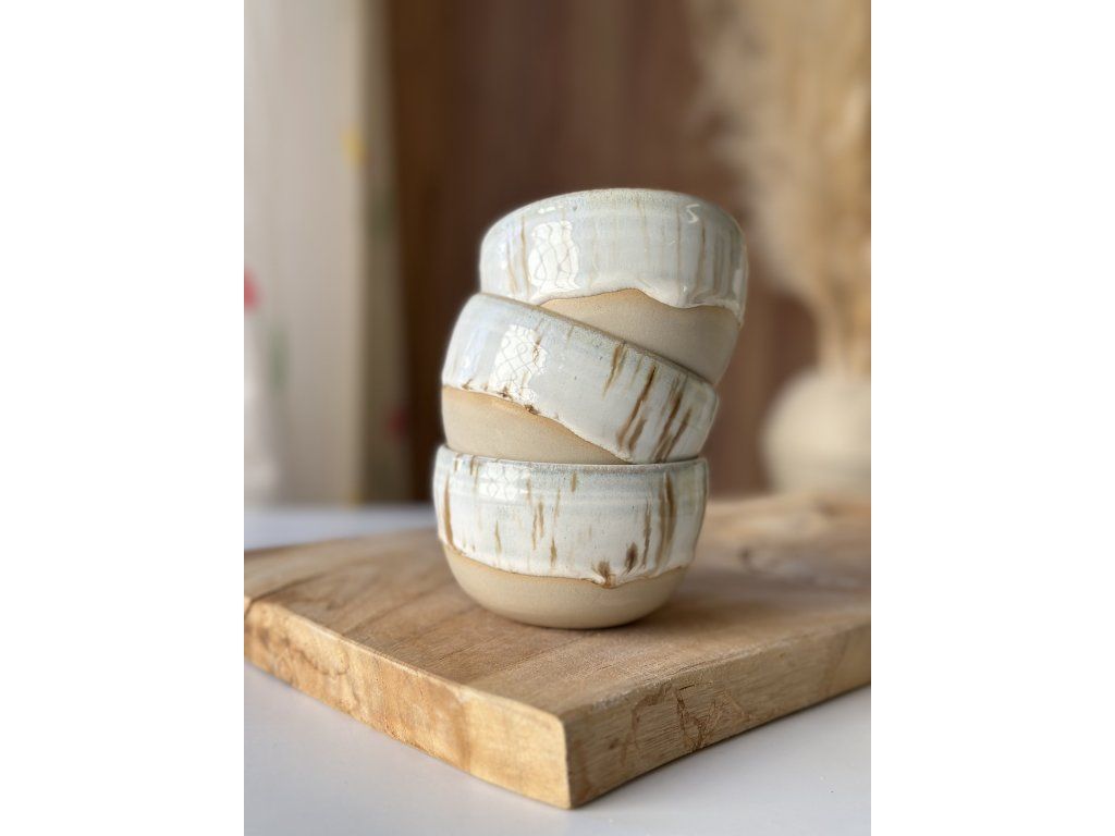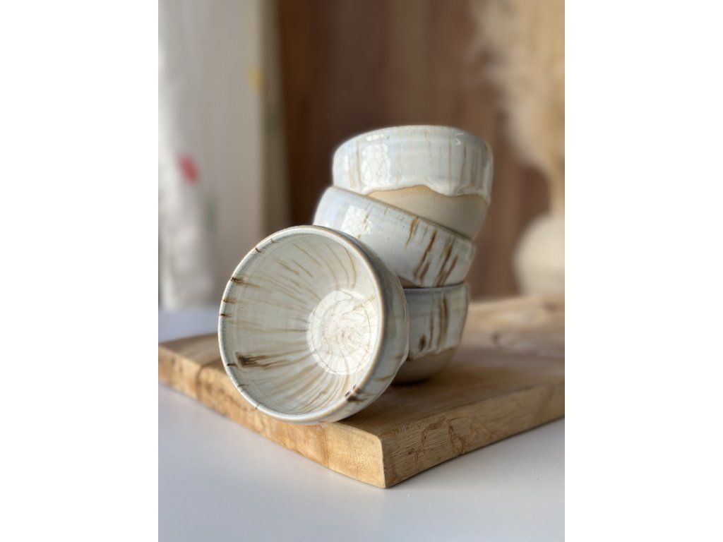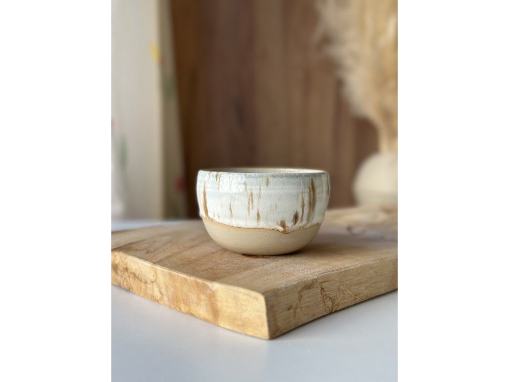 Ručně vyrobený kalíšek z kameniny, který vznikl na hrnčířském kruhu.
