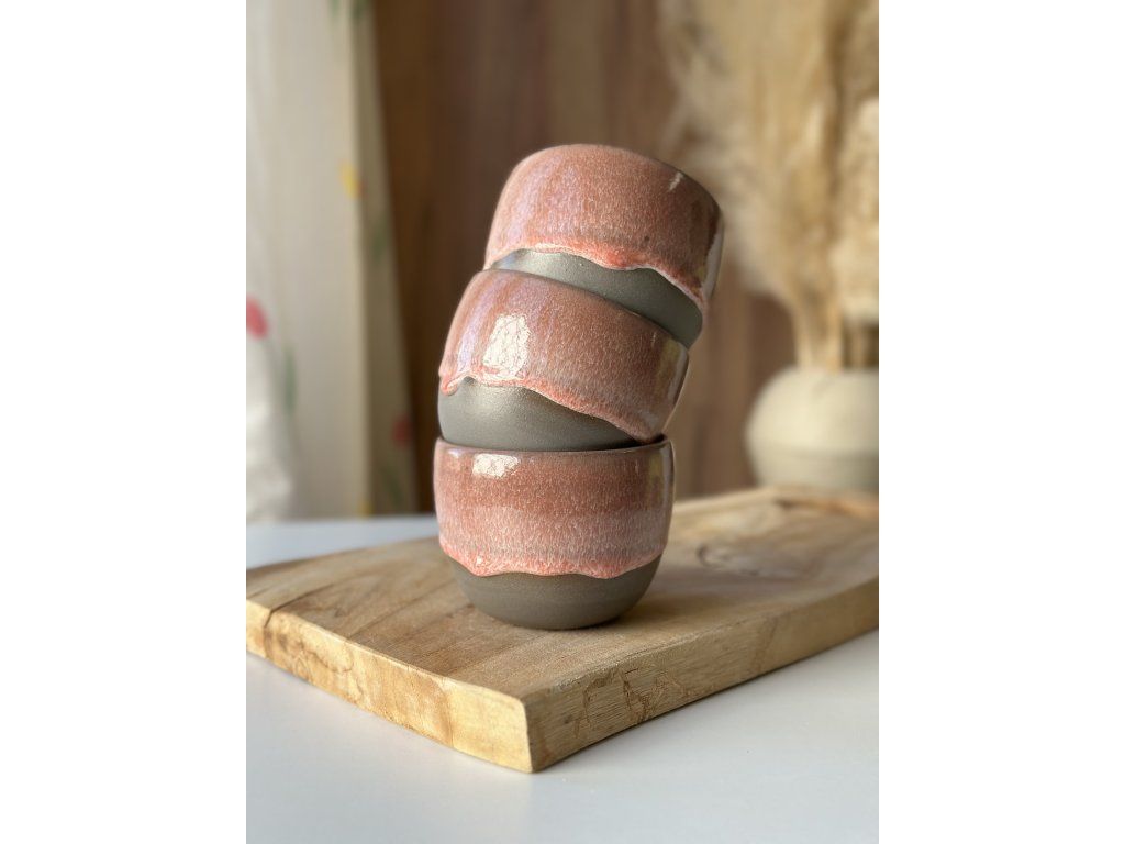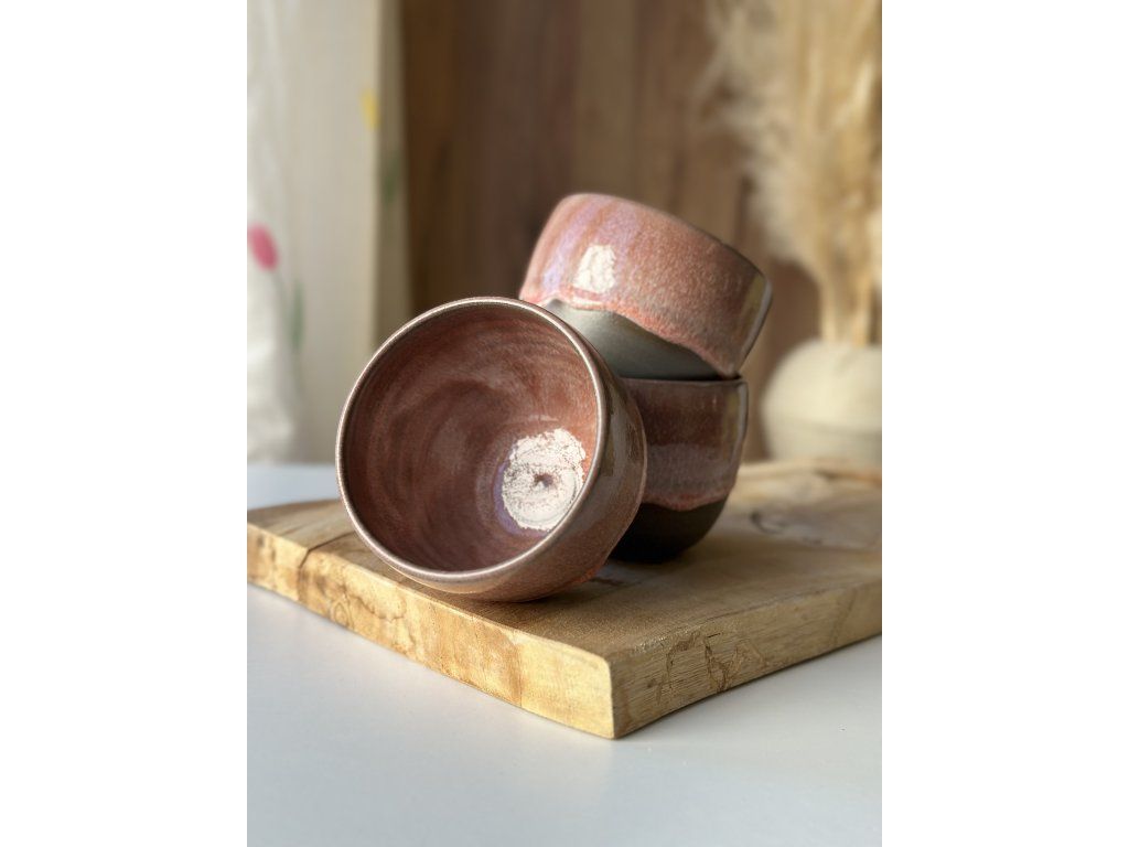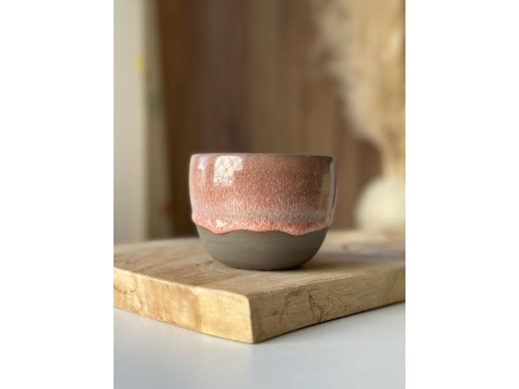 Ručně vyrobený kalíšek z kameniny, který vznikl na hrnčířském kruhu.
