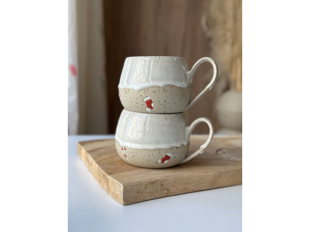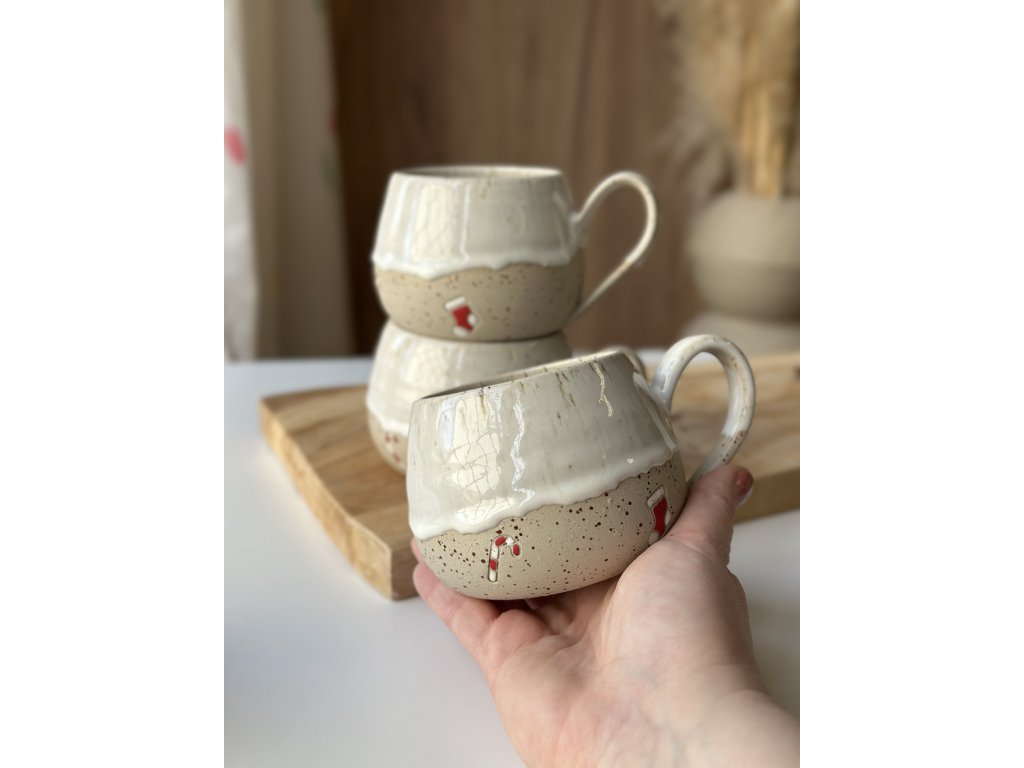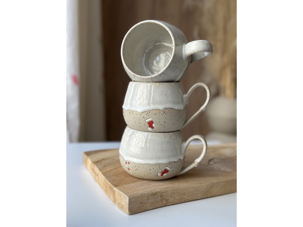Ručně vyrobený hrníček z kameniny, který vznikl na hrnčířském kruhu.
