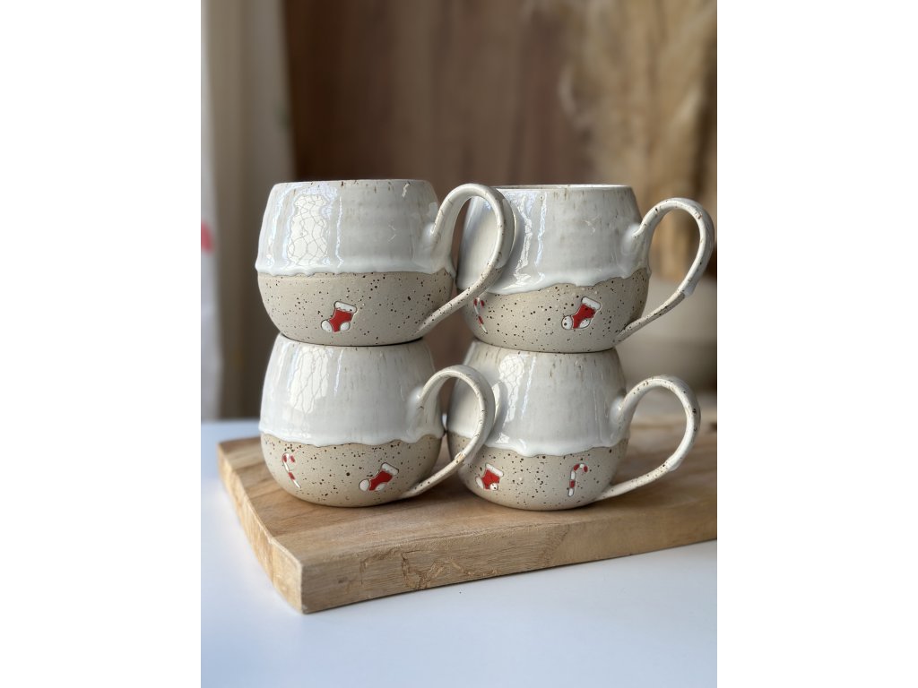 Ručně vyrobený hrníček z kameniny, který vznikl na hrnčířském kruhu.