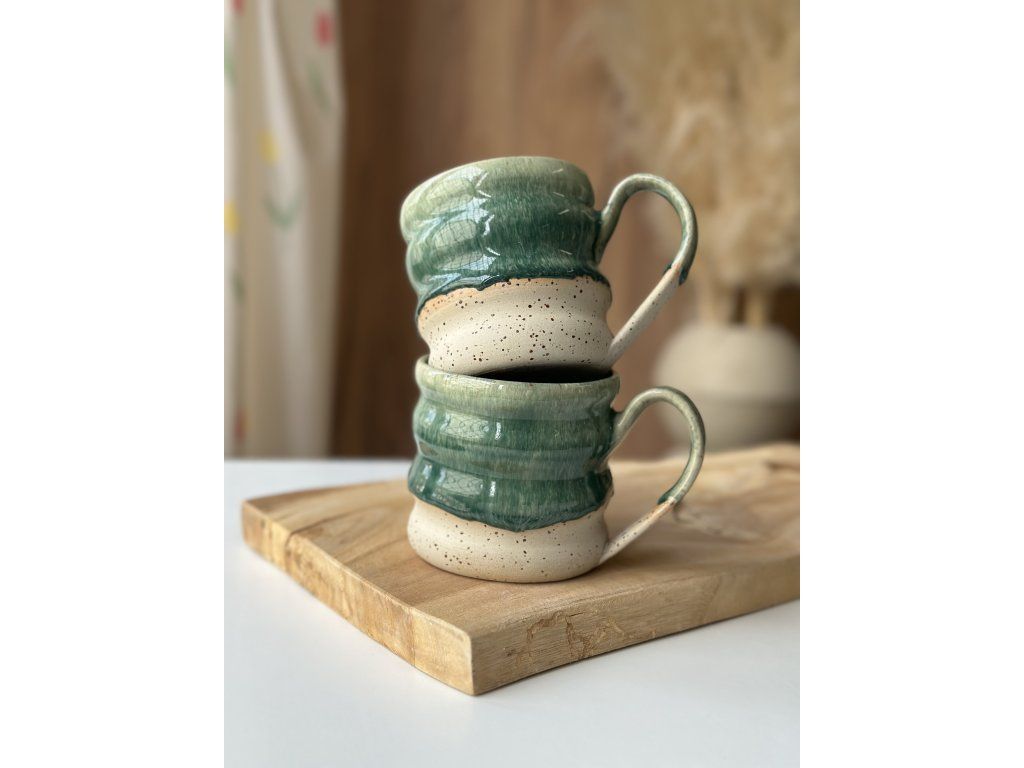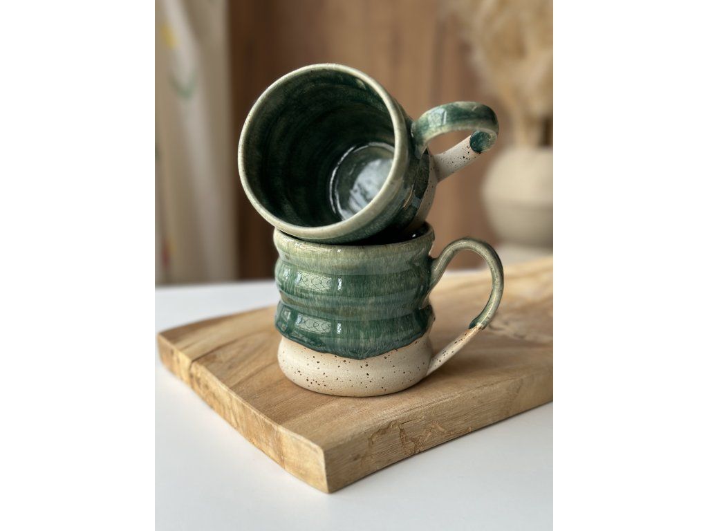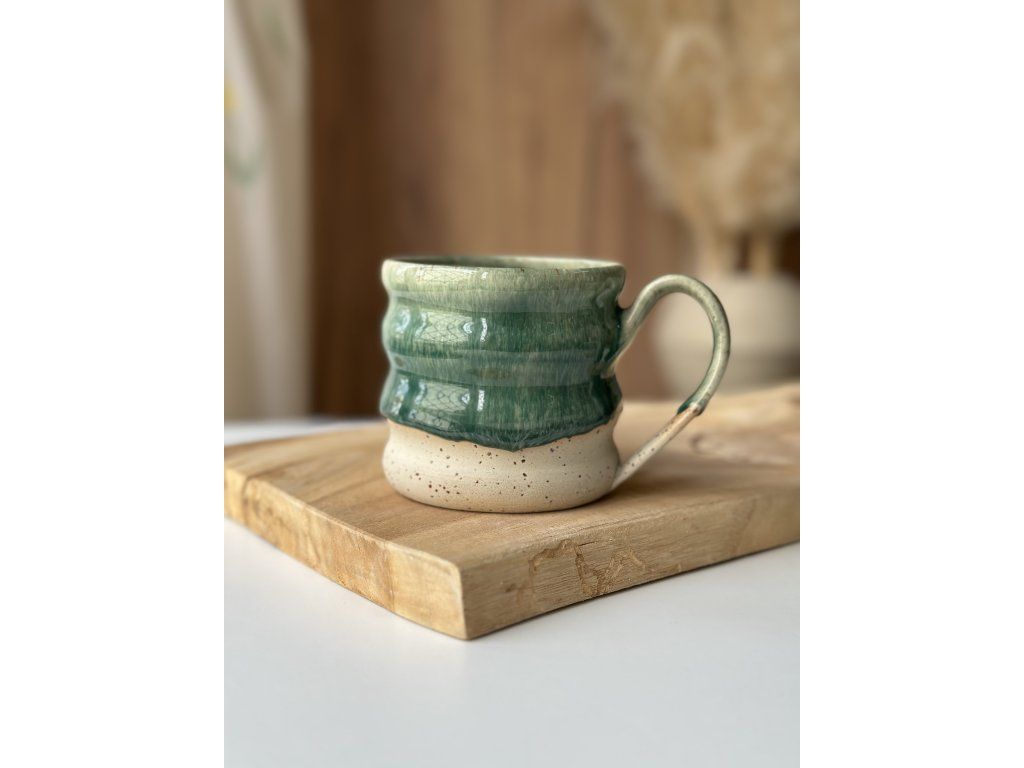 Ručně vyrobený hrníček z kameniny, který vznikl na hrnčířském kruhu.
