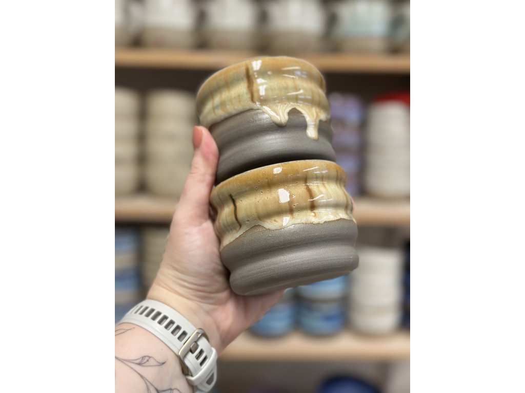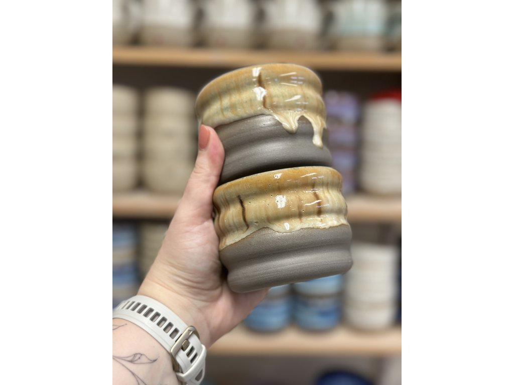 Ručně vyrobený kalíšek z kameniny, který vznikl na hrnčířském kruhu.