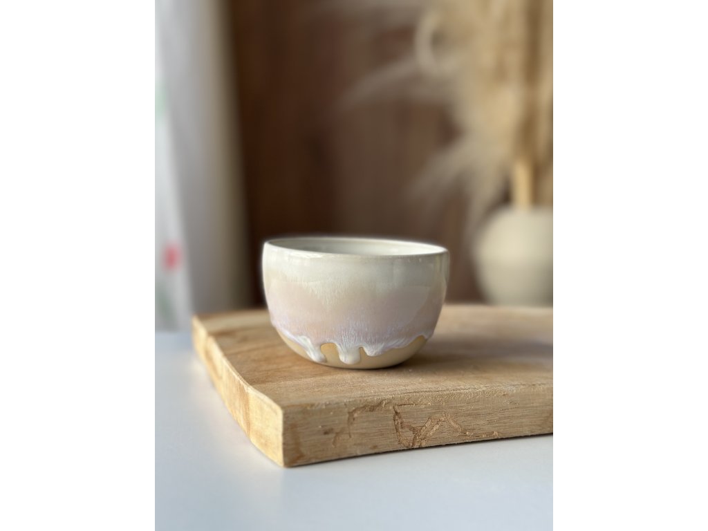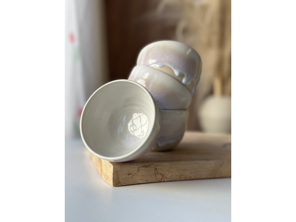 Ručně vyrobený kalíšek z kameniny, který vznikl na hrnčířském kruhu.