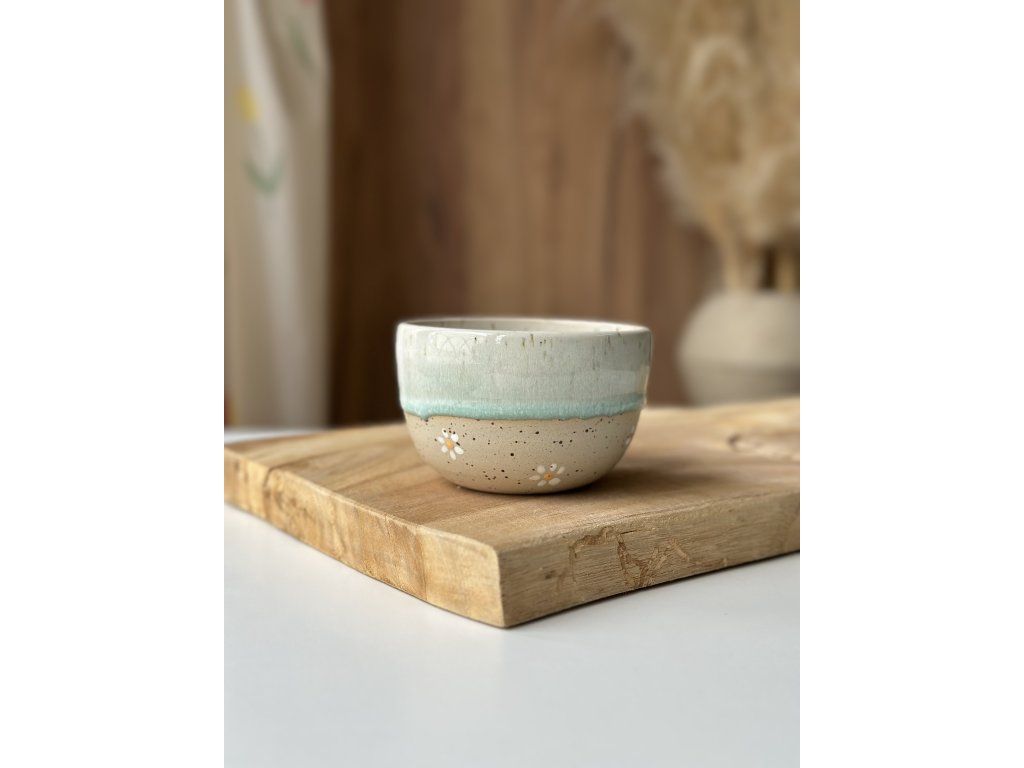 Ručně vyrobený kalíšek z kameniny, který vznikl na hrnčířském kruhu.