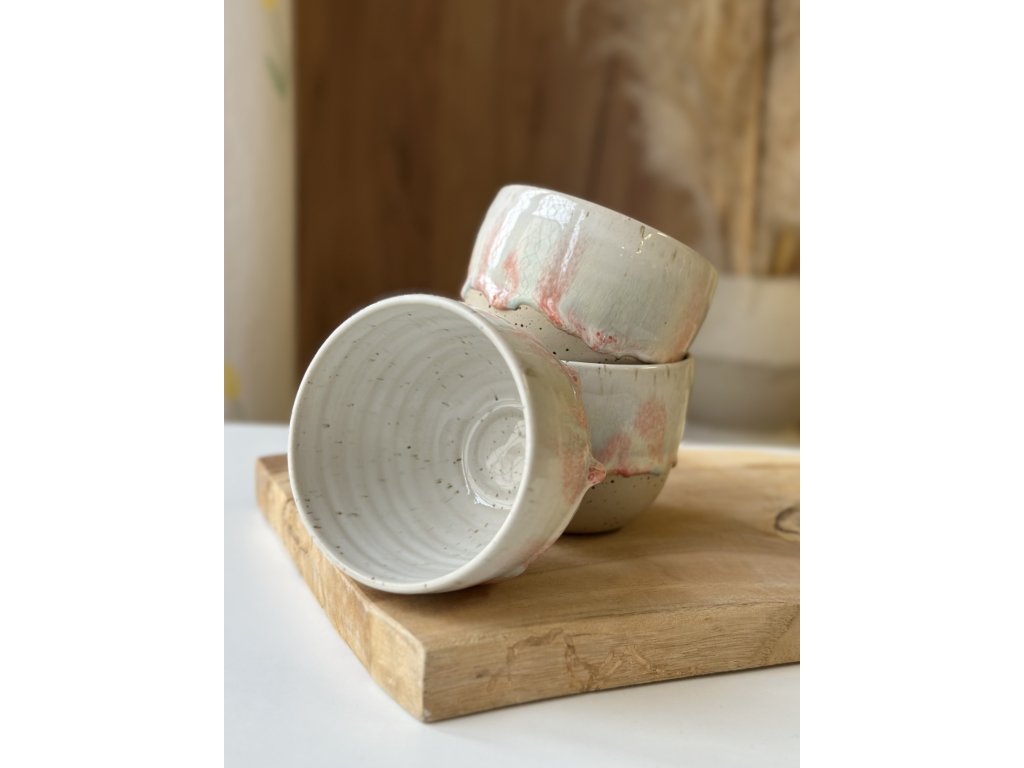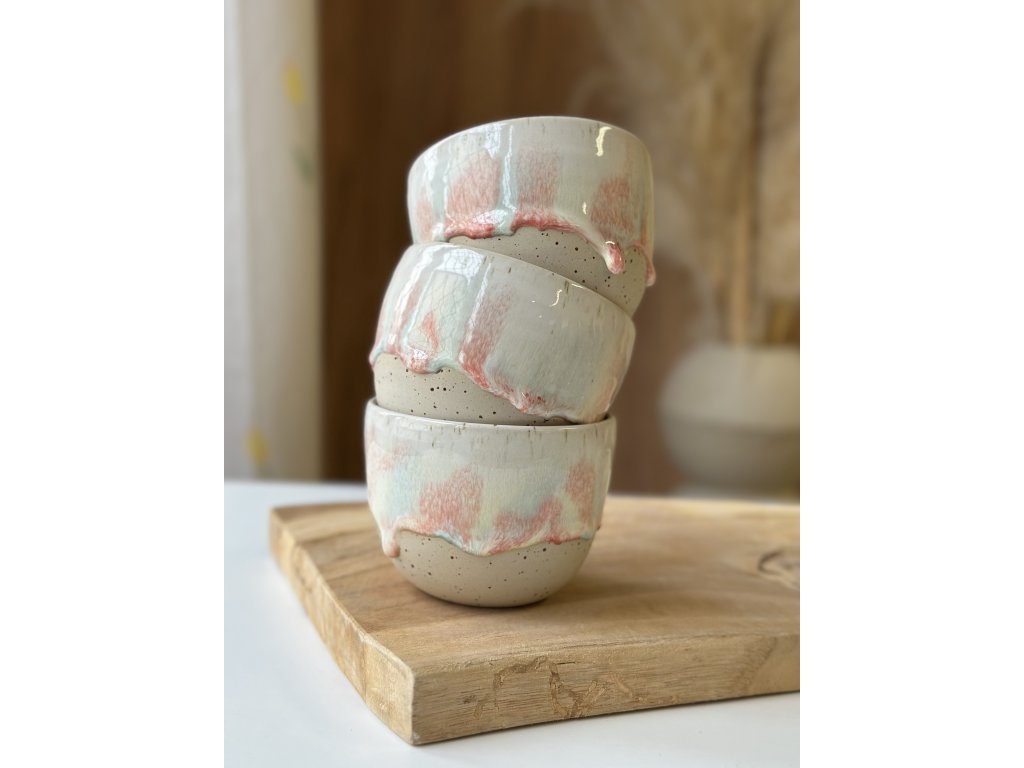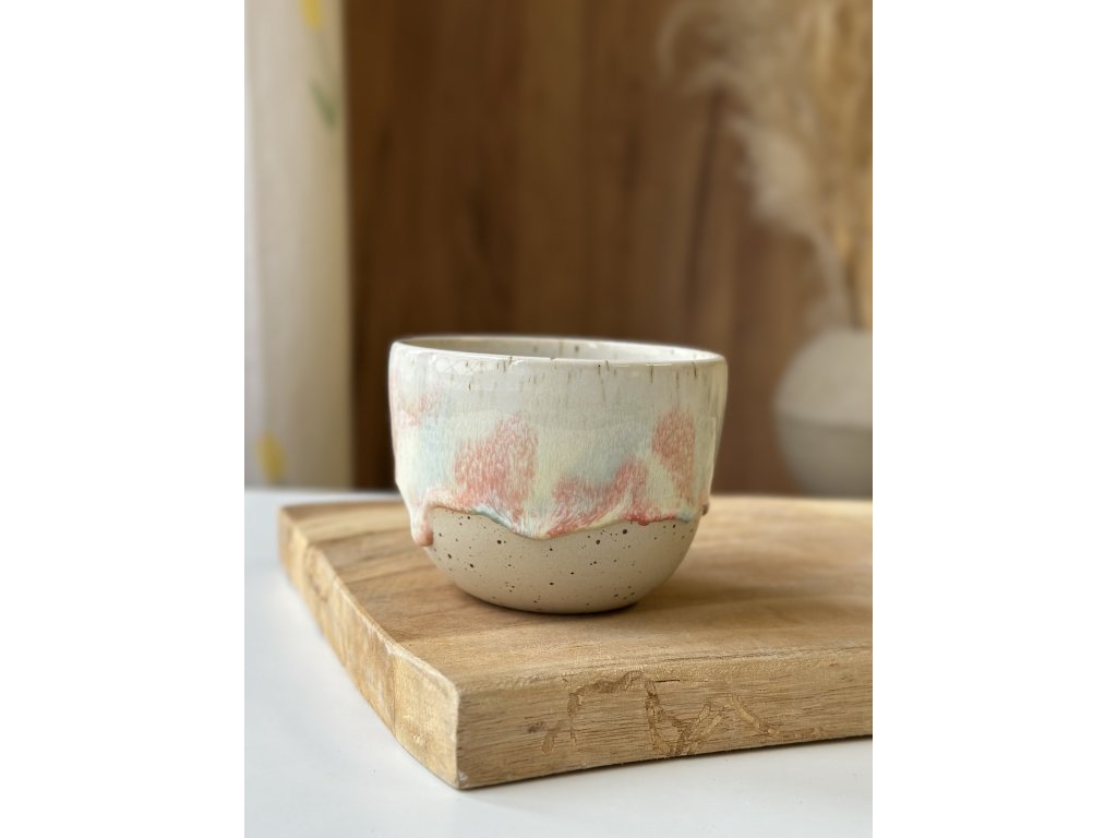 Ručně vyrobený kalíšek z kameniny, který vznikl na hrnčířském kruhu.
