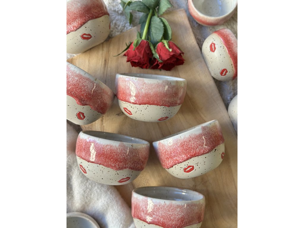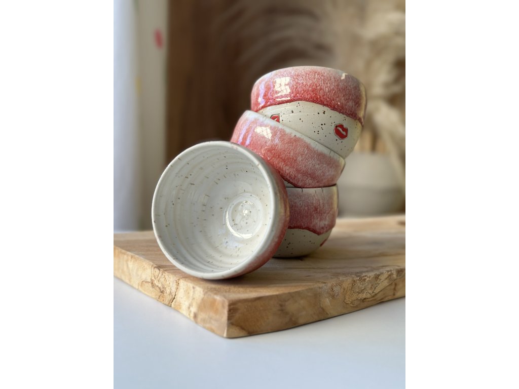 Ručně vyrobený kalíšek z kameniny, který vznikl na hrnčířském kruhu.