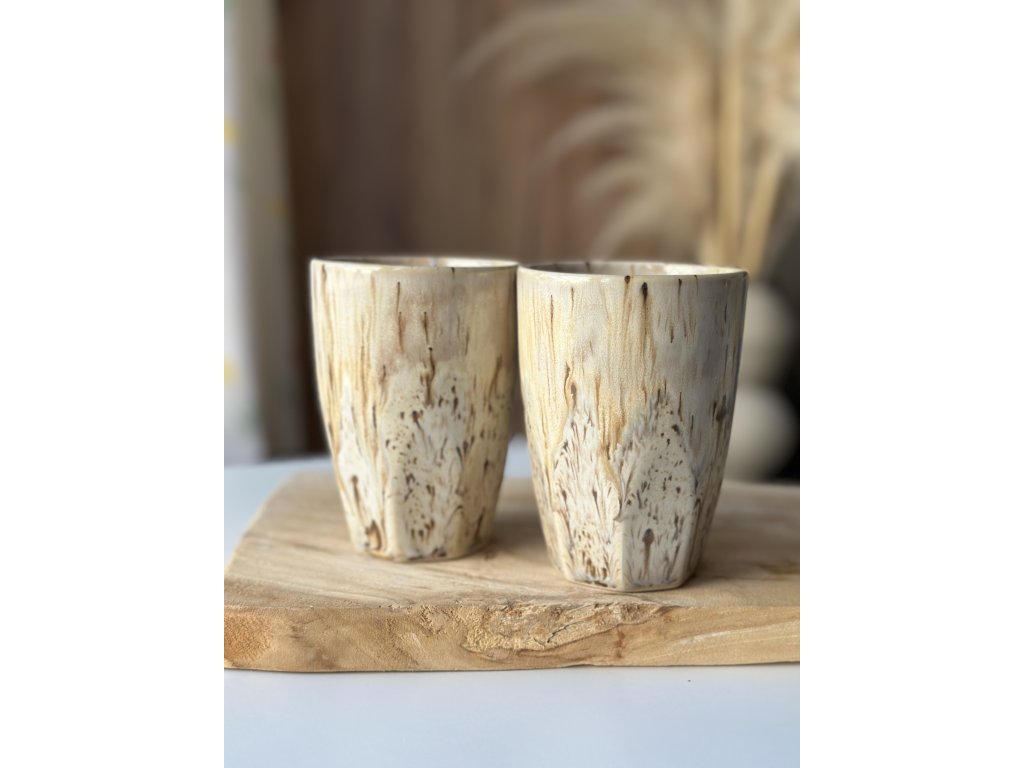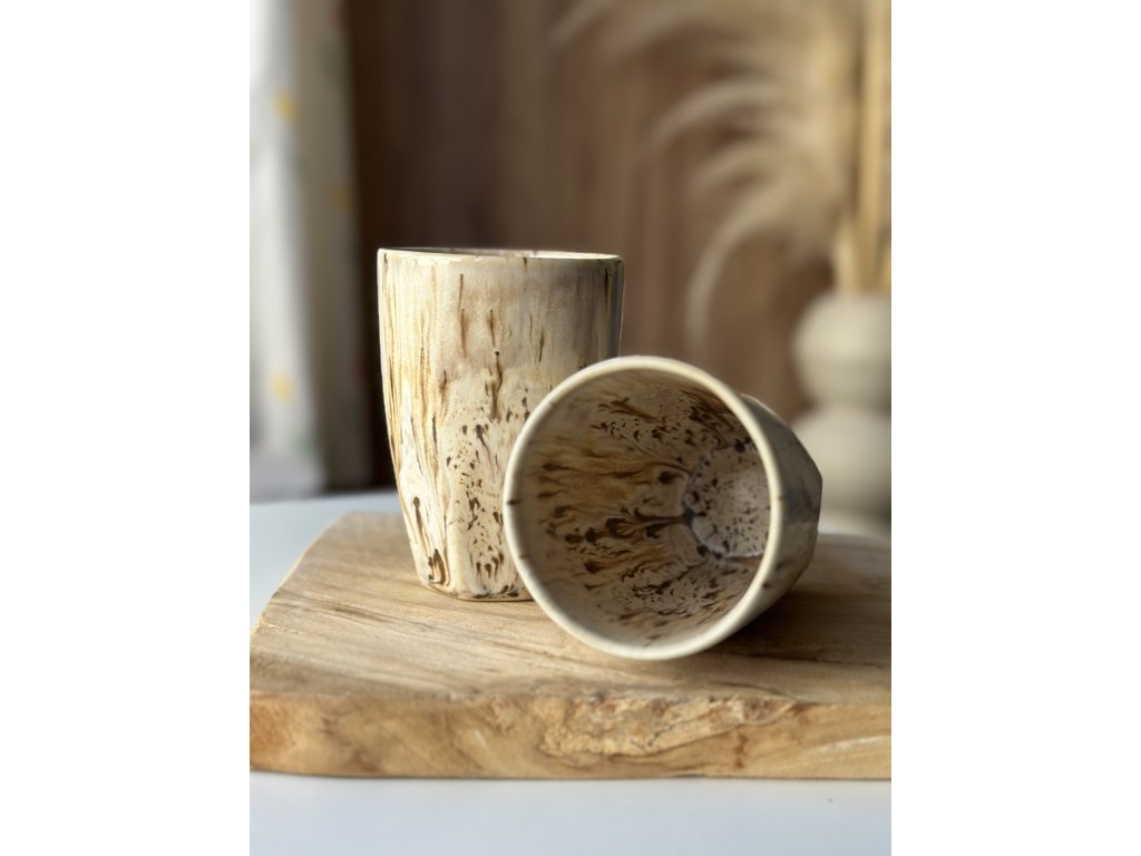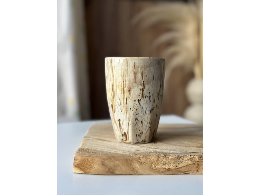 Ručně vyrobený kalíšek z kameniny, který vznikl litím do sádrových forem.