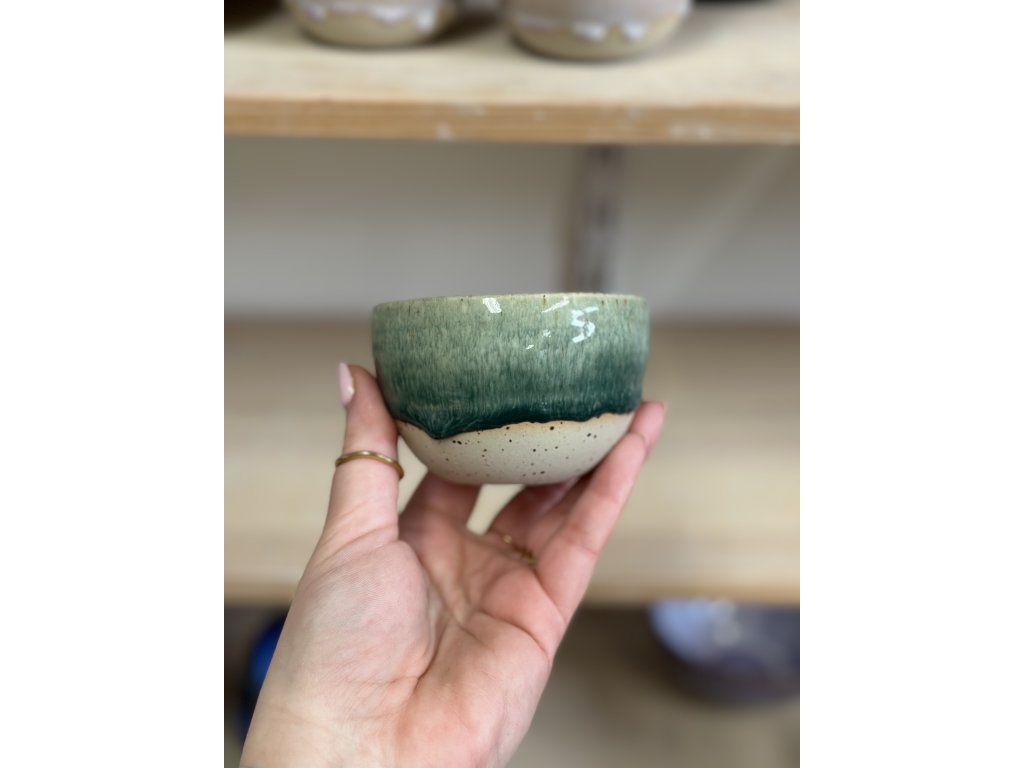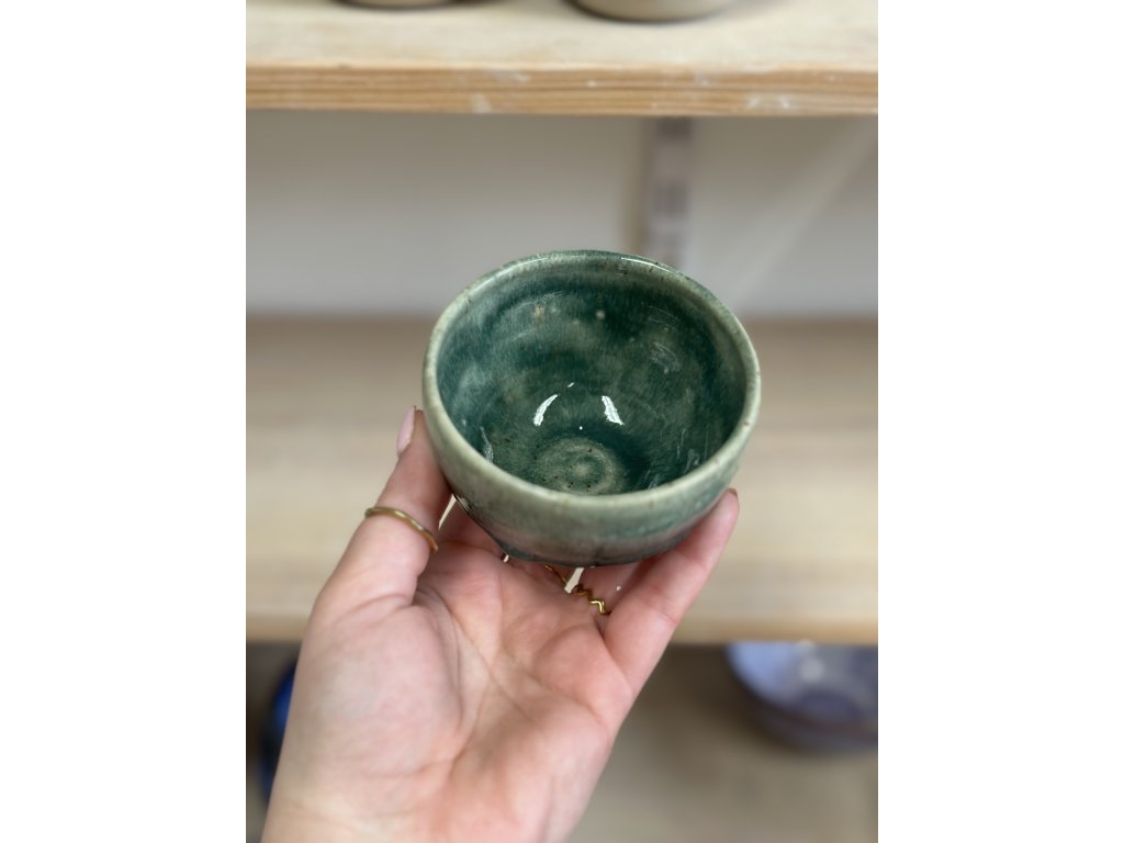 Ručně vyrobený kalíšek z kameniny, který vznikl na hrnčířském kruhu.