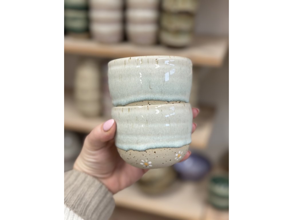 Ručně vyrobený kalíšek z kameniny, který vznikl na hrnčířském kruhu.