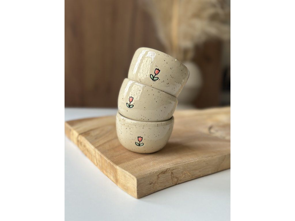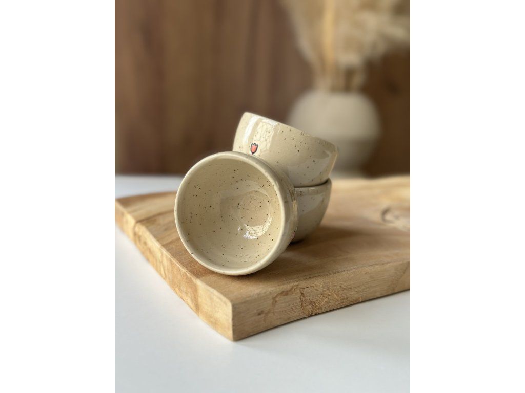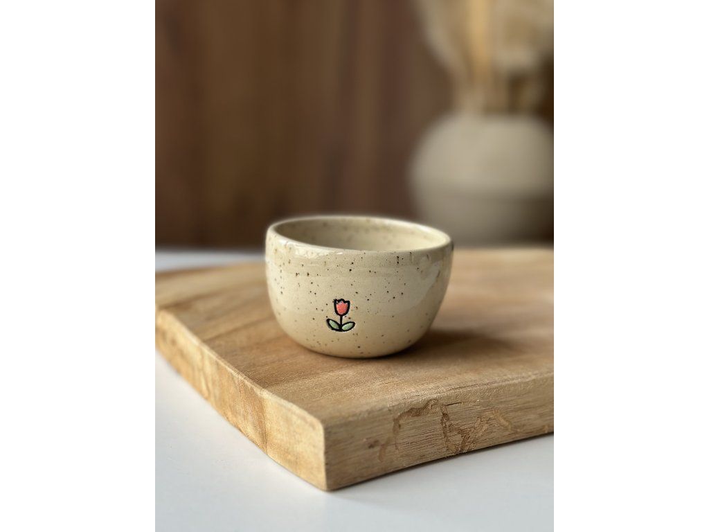 Ručně vyrobený kalíšek z kameniny, který vznikl na hrnčířském kruhu.