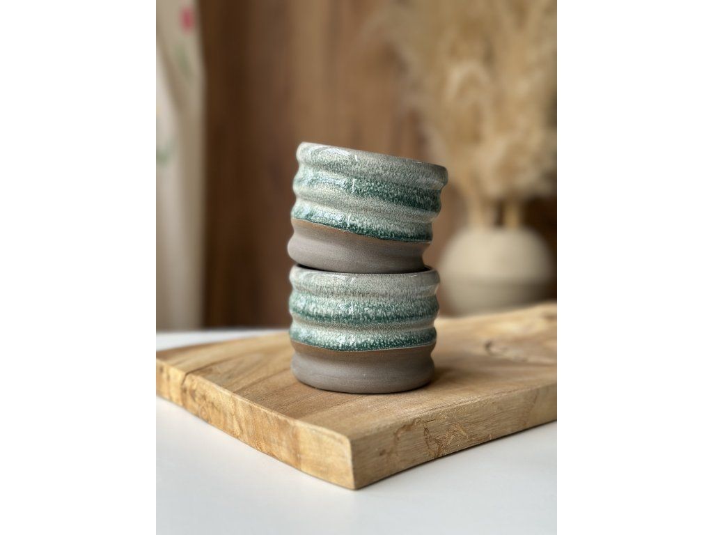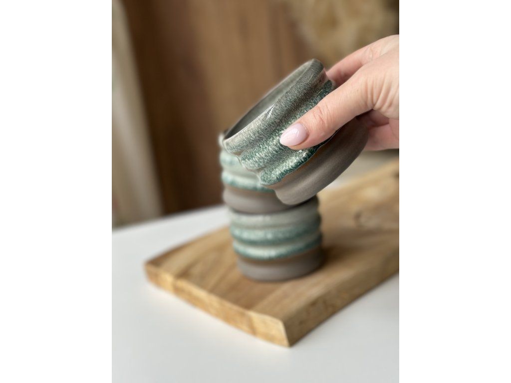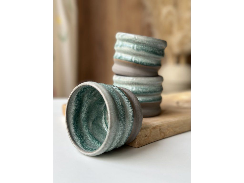 Ručně vyrobený kalíšek z kameniny, který vznikl na hrnčířském kruhu.