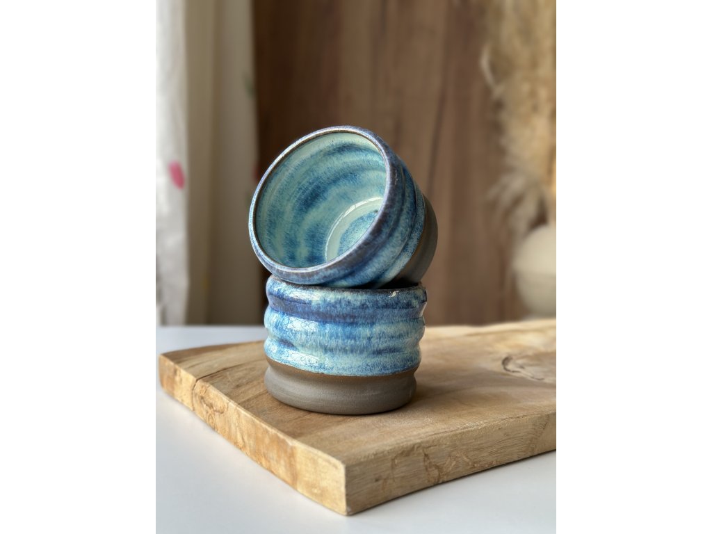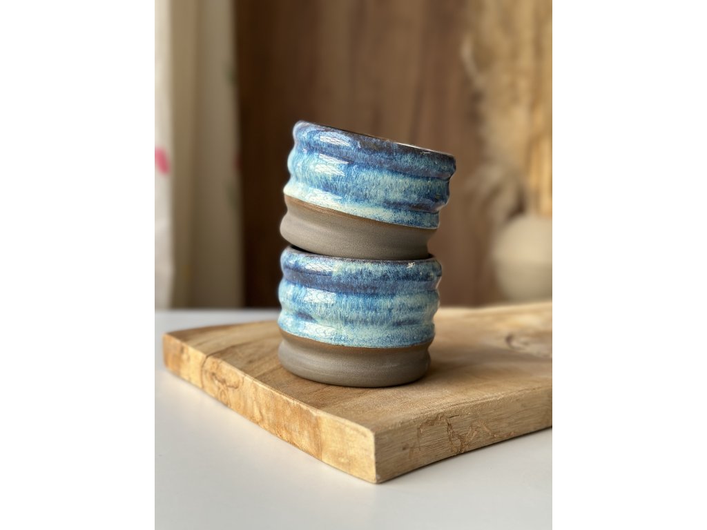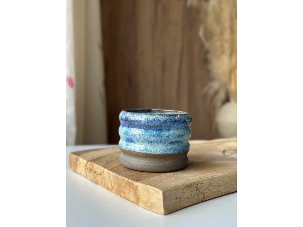 Ručně vyrobený kalíšek z kameniny, který vznikl na hrnčířském kruhu.