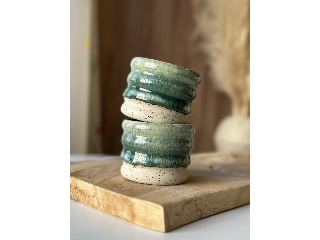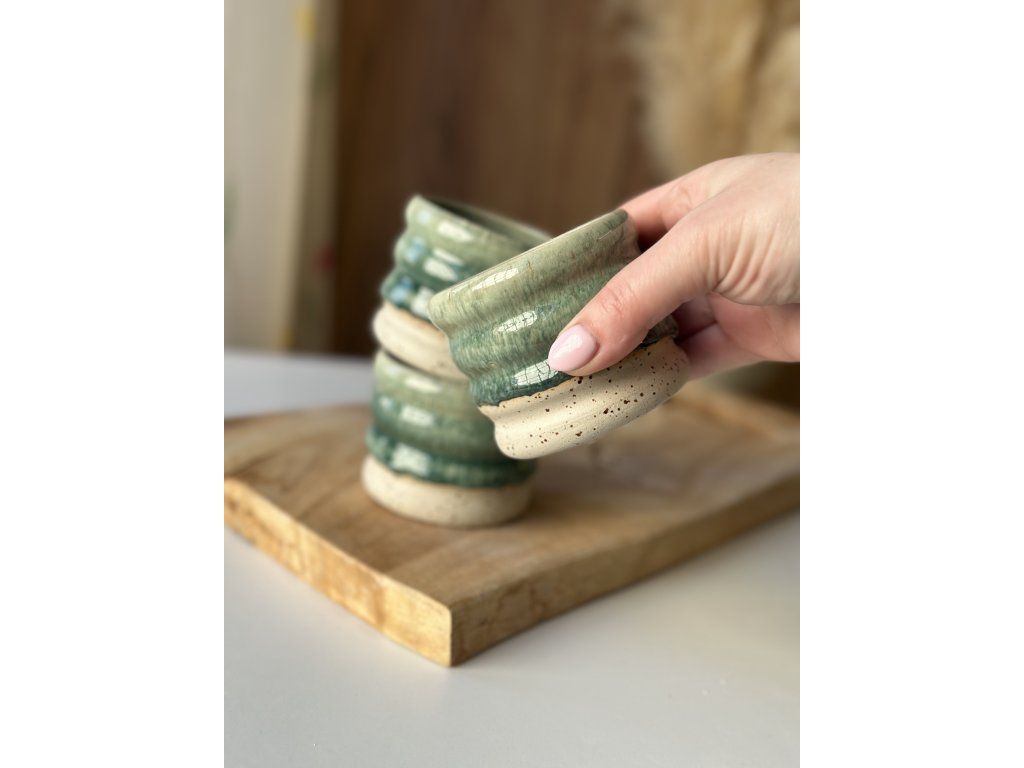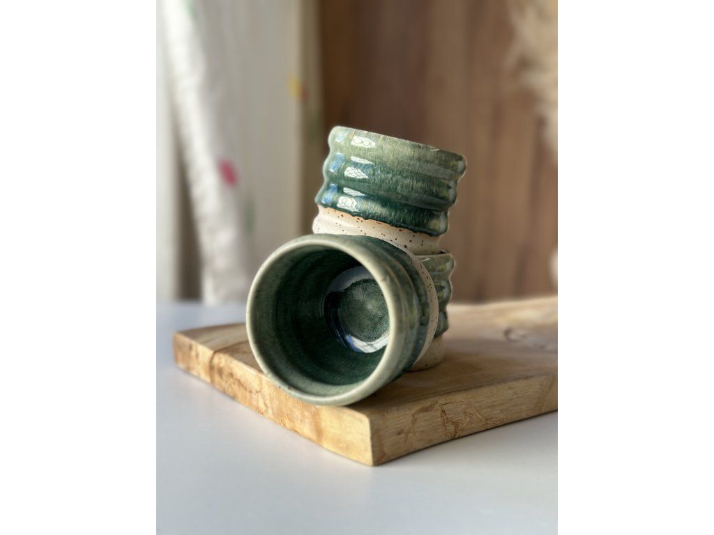 Ručně vyrobený kalíšek z kameniny, který vznikl na hrnčířském kruhu.